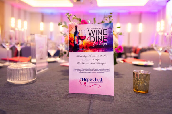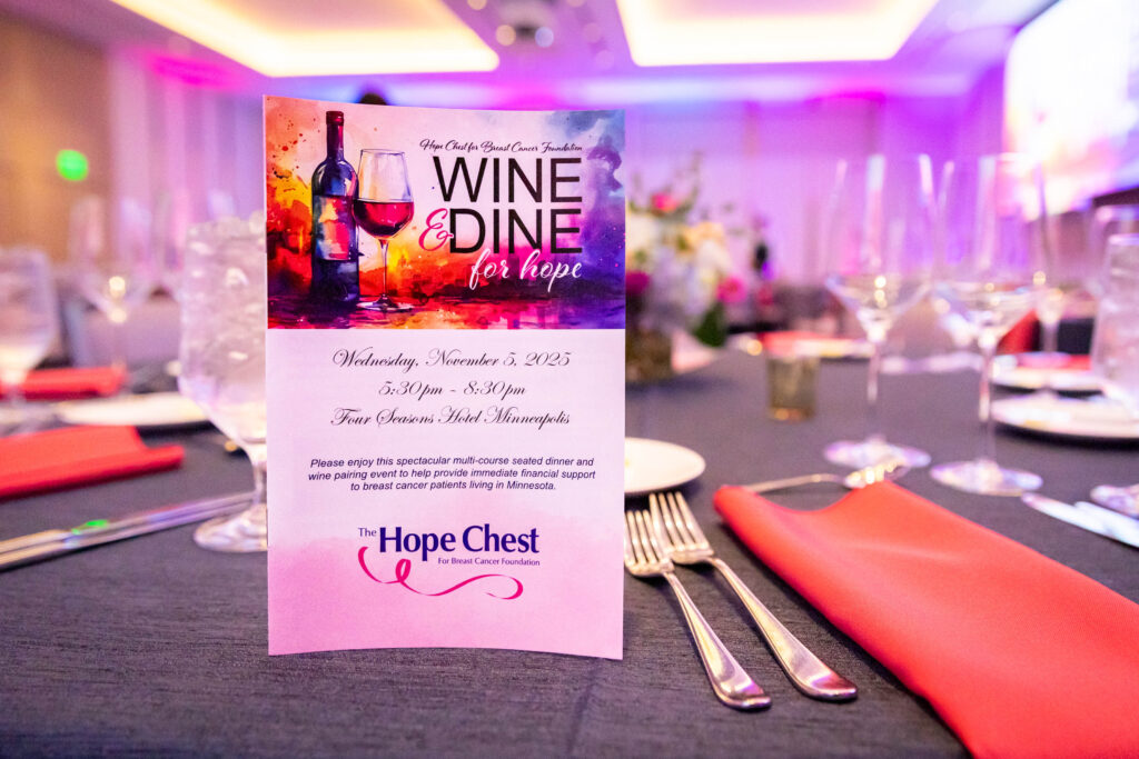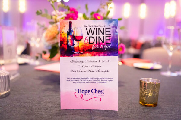 Each fall, Hope Chest for Breast Cancer Foundation hosts Wine & Dine for Hope—a spectacular evening that has become a cherished tradition for our supporters, donors, community partners, and guests. This exclusive, multi-course seated dinner and wine pairing event brings together culinary excellence and compassionate giving in an intimate setting.